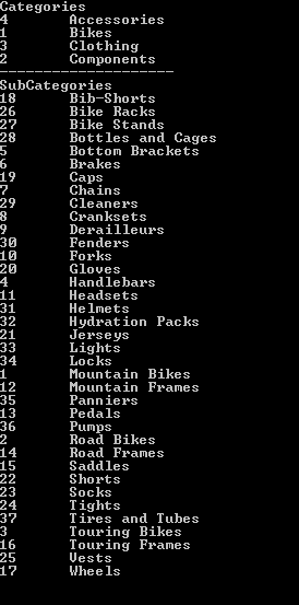 20 “SELECT ProductSubcategoryID, Name FROM [Production].[ProductSubcategory]”;