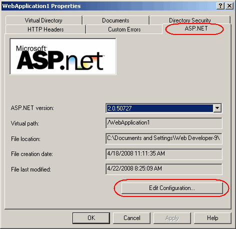 4. At the ASP.NET tab, you should see and click Edit Configuration. (if you’re opening Properties of a website, you should also see an “Edit Global Configuration” button which corresponds to the machine wide web.config). Doing so should display the Configuration Settings Dialog