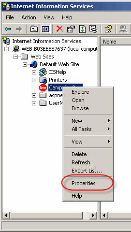 2. Right Click on target site/virtual directory and select Properties