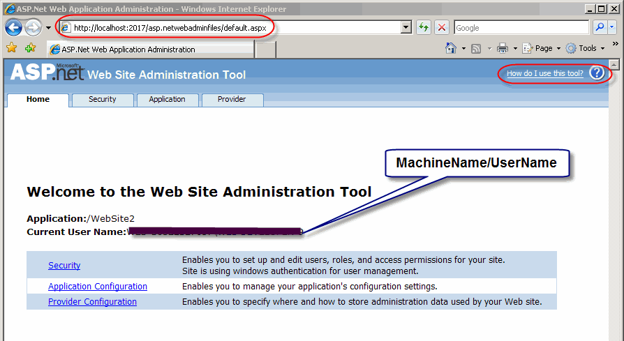 The “Website->Asp.Net Configuration option in Visual Studio” mentioned are items in the toolbar and appears if you have the website project (or its files) open/selected (see image below)