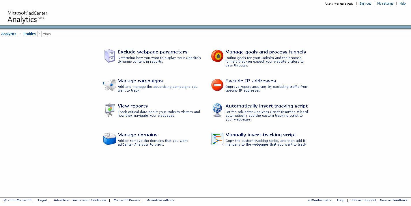 After completing the actual signup for adCenter Analytics, there is a wizard to set you profile information (similar to Google Analytics) along with the domain (site) that you will track/manage. And then a screenshot of the Analytics Main page (sort of dashboard) can be downloaded here.