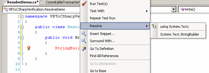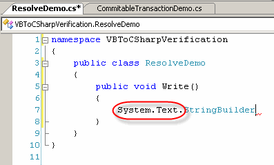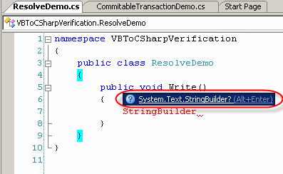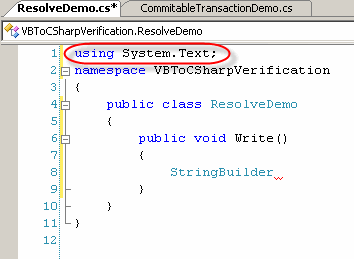 So to resolve the namespace in Visual Studio (2005, not sure about 2003 yet, but for sure 2008 has this too), here are the steps: (using StringBuilder as the class for this example)